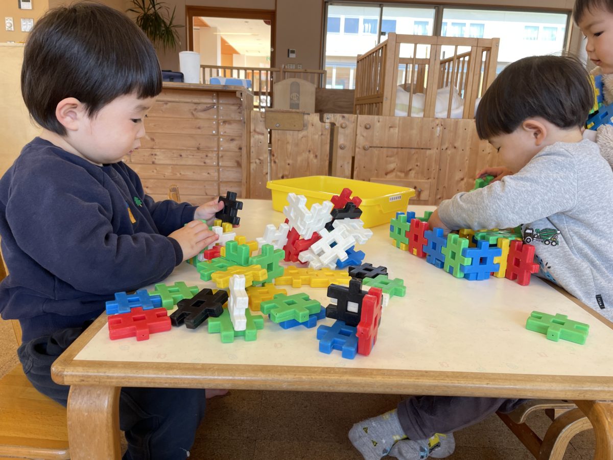 ブロックで箱づくり!真剣な顔で各々に箱を作って楽しんでました。