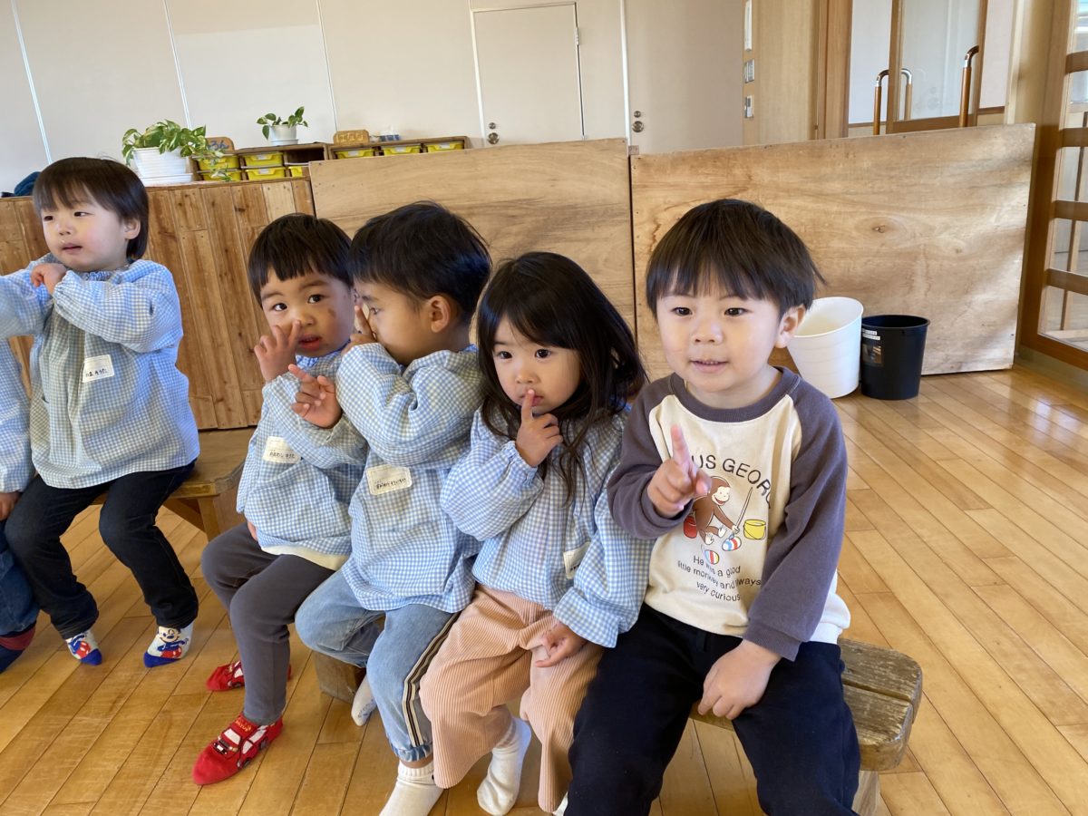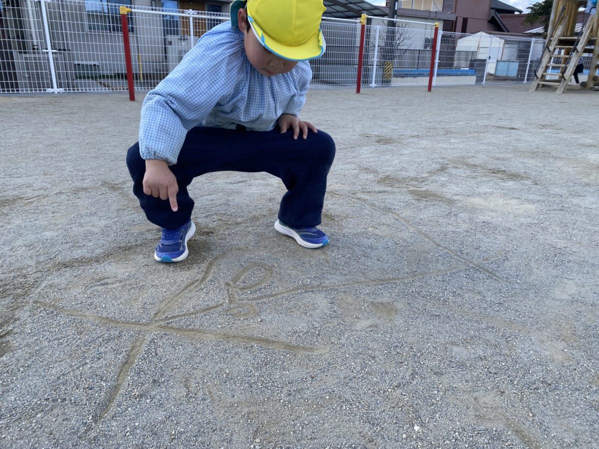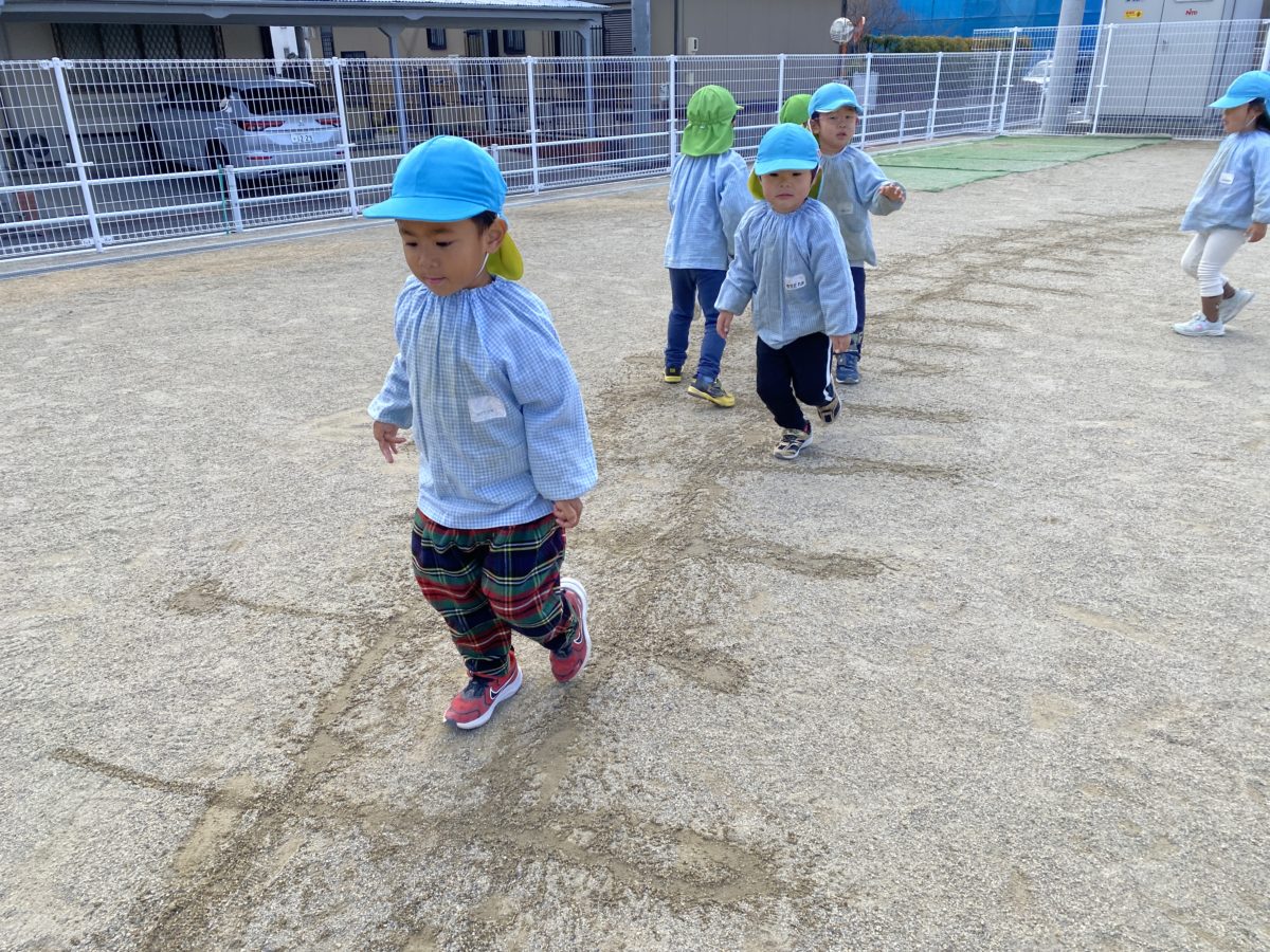 今日も元気に歌を歌っていたお友だち。さくらんぼ組さんも口を大きく開けて歌っている様子があり、途中足踏みしたり手遊びを交えるなど全身を使って歌うことを楽しんでいました。その様子を見ていたりんご組さんは「シーだよ!」と静かに見ることを教え合ったり、「ここあいてるよ!」と椅子に座れていないお友だちに声をかけたりと周りを見て行動できるお友だちが増えてきました。また、自分の知っている曲になると、口ずさんだりしてお兄さん、お姉さんと一緒に歌うことを喜んでいるようでした。ダンスは3チームに分かれて見せ合いっこをしました。どんな曲が流れてくるか分からない中、いざ曲が流れると待ってましたと言わんばかりに元気いっぱい踊っていました。めろん組さんが積極的に前に行って踊っている姿を見て、少し緊張しているさくらんぼ組さんも少しずつ笑顔で踊れるようになりました。また、ダンスを見ている時も同じチームのめろん組さんが「しずかにすわってね」と教えており、とても頼もしかったです。戸外では電車ごっこを楽しむ様子がたくさん見られ、線路に沿って「がたんごと~ん」と言いながらお友だちと走っていく姿がありました。その線路をみて地面に踏切を描こうとするさくらんぼ組さん。書き終わると「みて~、ふみきりかいたの!」と嬉しそうにお友だちに見せていました。その他にもキャラクターや果物を描いていると、お友だちがたくさんそばにきて「○○かこっかな~」「これかいてみてよ!」と会話を弾ませながら色々なイラストを描いていました。また、雲の形に興味を示したお友だちは、空を見上げて「ぶたの形のくもがある!」「こっちはカブトムシみたい!」と気付いたことをお友だちと共有していました。