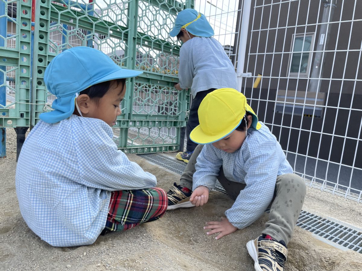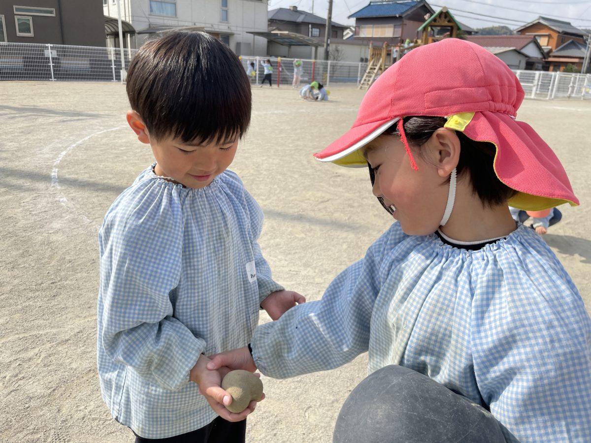 戸外では先日板に付いていた土の塊から、塊のおだんごづくりにハマる子がいたり、だんごを丸ではなくサイコロの形や、ハートに作る子が増えてきていて、今日もその違う形の団子づくりを楽しんでいました。塊は板の上だけでなく砂の上でも作っており、園庭に何やら化石の発掘作業のようにサラサラの砂を掛けて塊を一生懸命撫でるお友だちも。「石みたいにピカピカにするんや~!」と張り切って砂を撫でて磨いていて、見た目は石みたいでとても面白かったです。ハート形のお団子を作っている子は、なんと昨日からの続きのようで、「昨日のやつやのに、壊れてなかったで~!」と話してると反対側から見ていたお友だちが「えっ!すっご!おしり形?」「違うよ!ハートの形だよ~!」というと「こっちから見たらおしりの形に見えたよ~。」と笑い合っていました。