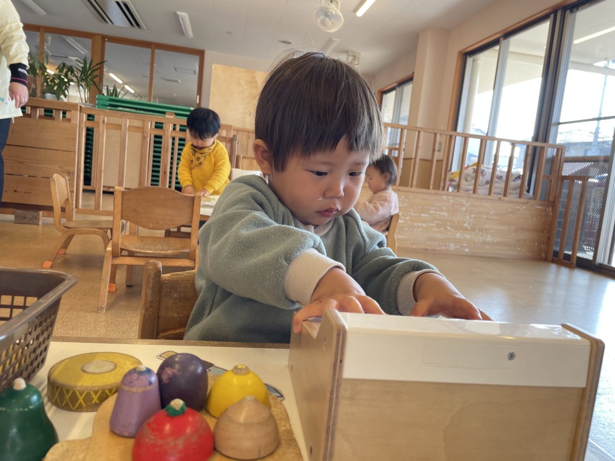とんとんとん。とおもちゃの包丁を片手に何やら作っているお友だち。椅子に座り、まな板と包丁を使い一生懸命木製の果物や野菜を切る真似をしていました。そんな姿を遠目に見ていたお友だちも、隣へ座り一緒にとんとんっと何やら楽しそうに作っていました。すると「みてーできたよ!」「ぱんやけたよ」「こやってきるの」「ちょっとまっててね~」とどうやらパンを作っていたようです。「はい、どうぞ~」とお友だちとやり取りをしながらとっても楽しそうな子どもたちでした。
