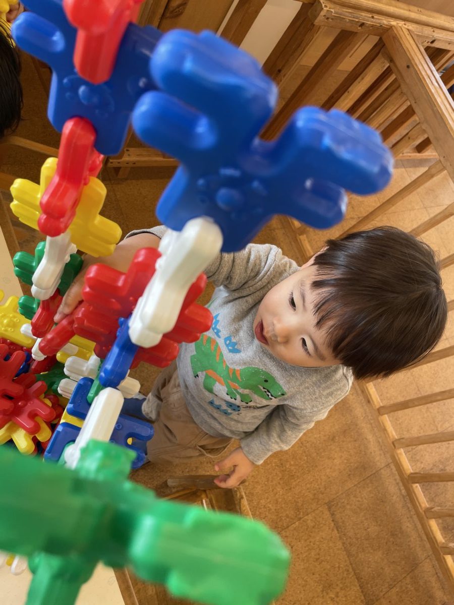 一方別の場所ではうさぎの形をしたブロックに興味津々な子どもたち。早速ブロックを手に取ると黙々とブロック同士をつなぎ合わせたり積み上げたり。気付けば机の上いっぱいな大きなブロックの塊になっていました!段々と大きくなるにつれ手が届かなくなってくると「はいどうぞ」「はい!」とまるでバケツリレーのようにお友だちにブロックを受け渡しながら協力して大きなブロックの塊を作りながら遊ぶ子どもたちでした。