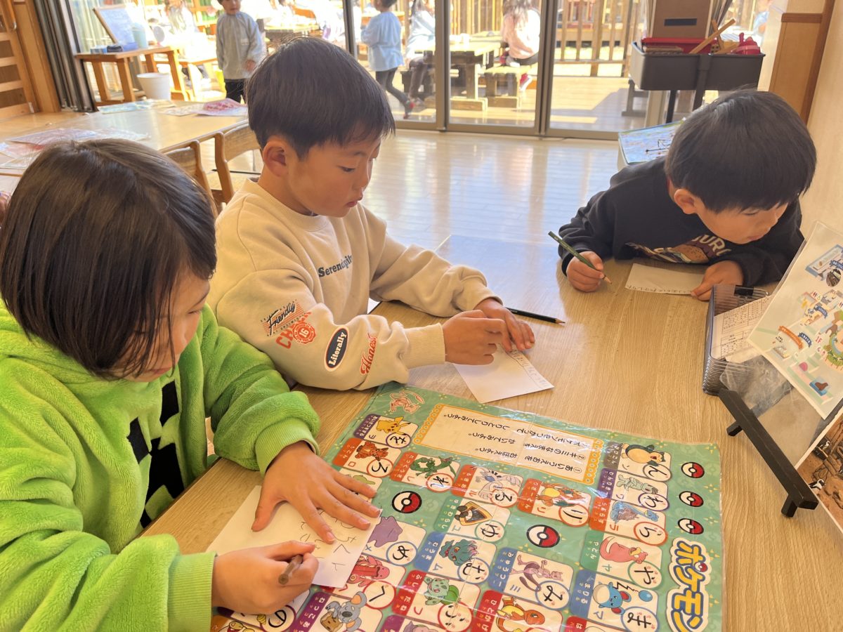 最近人気のポケモンのひらがな表を見ながら、ばなな組のお友だちも平仮名を書くのに挑戦!