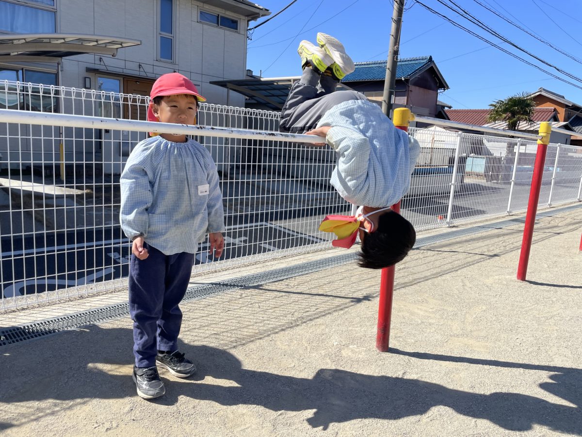 めろん組のお友だちが鉄棒でお友だち同士で「前回り出来る?」「出来やん!どうやってするん?」「分かった見とってな!」「おおー!すごい!」と言いながら鉄棒を楽しむ姿がありました。「なんで前回り出来るの?」「どうやってするの?」と鉄棒のできる子に羨ましそうし、コツを教えって貰ったり、ひたすら前回りを見せてあげていたりと自分たちでどうしたら前回りが上手くいくのかを話す姿があり、分からないことは自分たちで考えて相談していたりし、その姿にとても感心をしました。