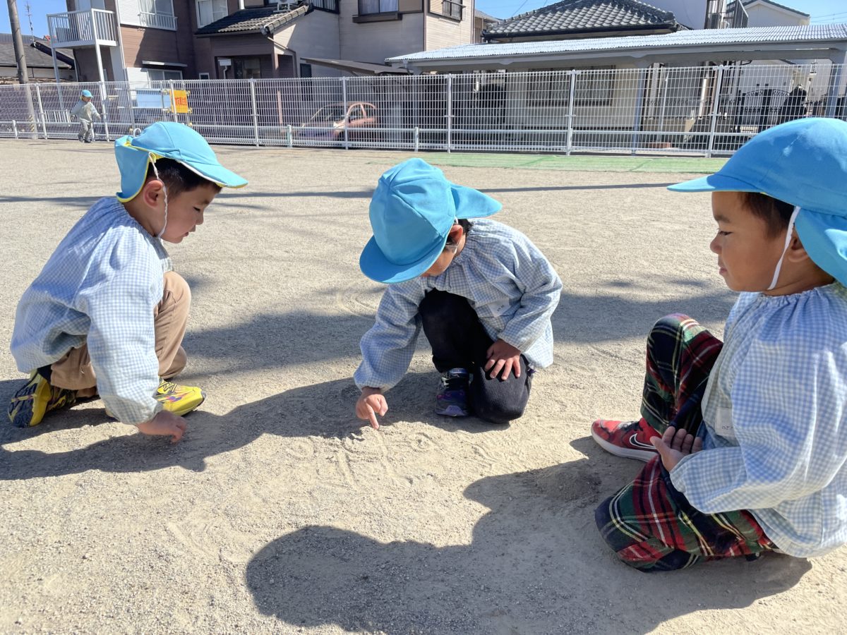 園庭にウサギや色々な動物を書いて楽しんでいました。