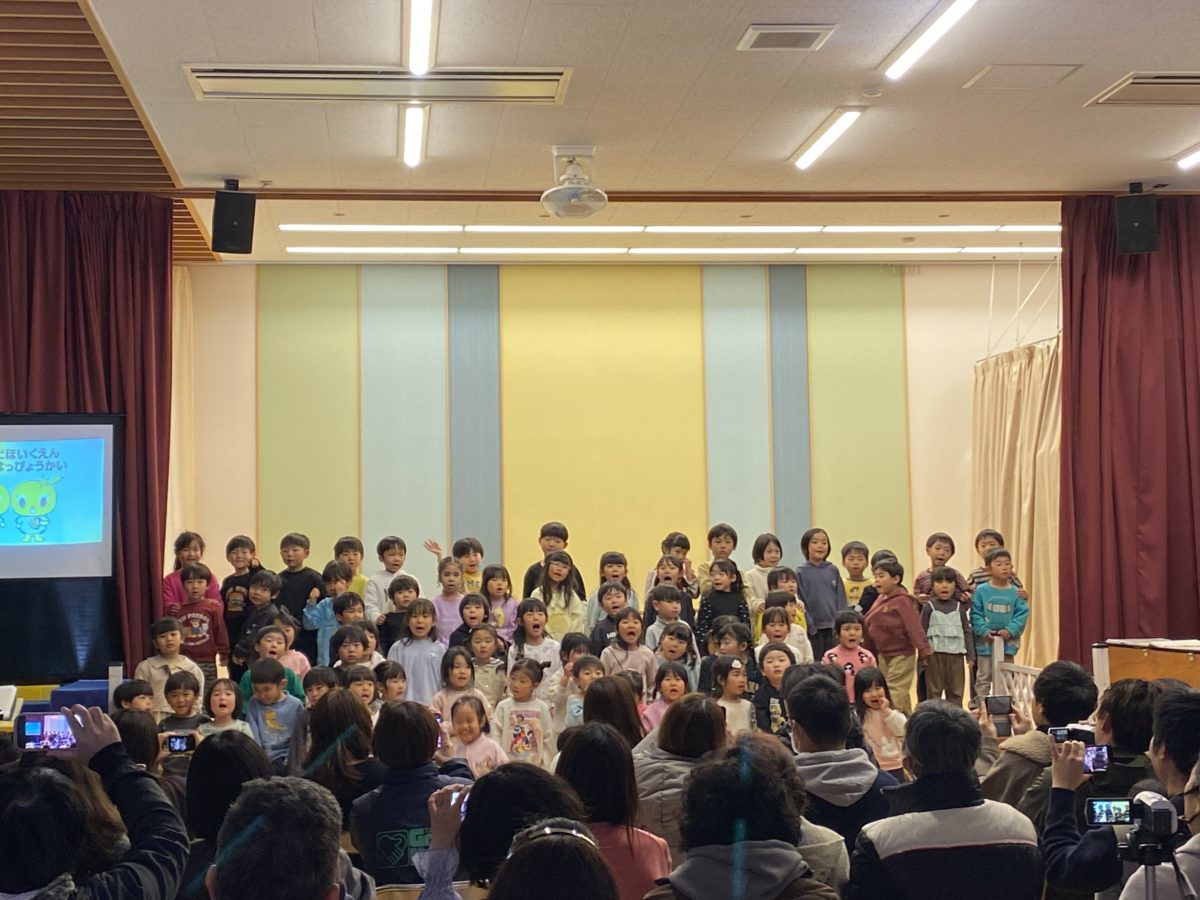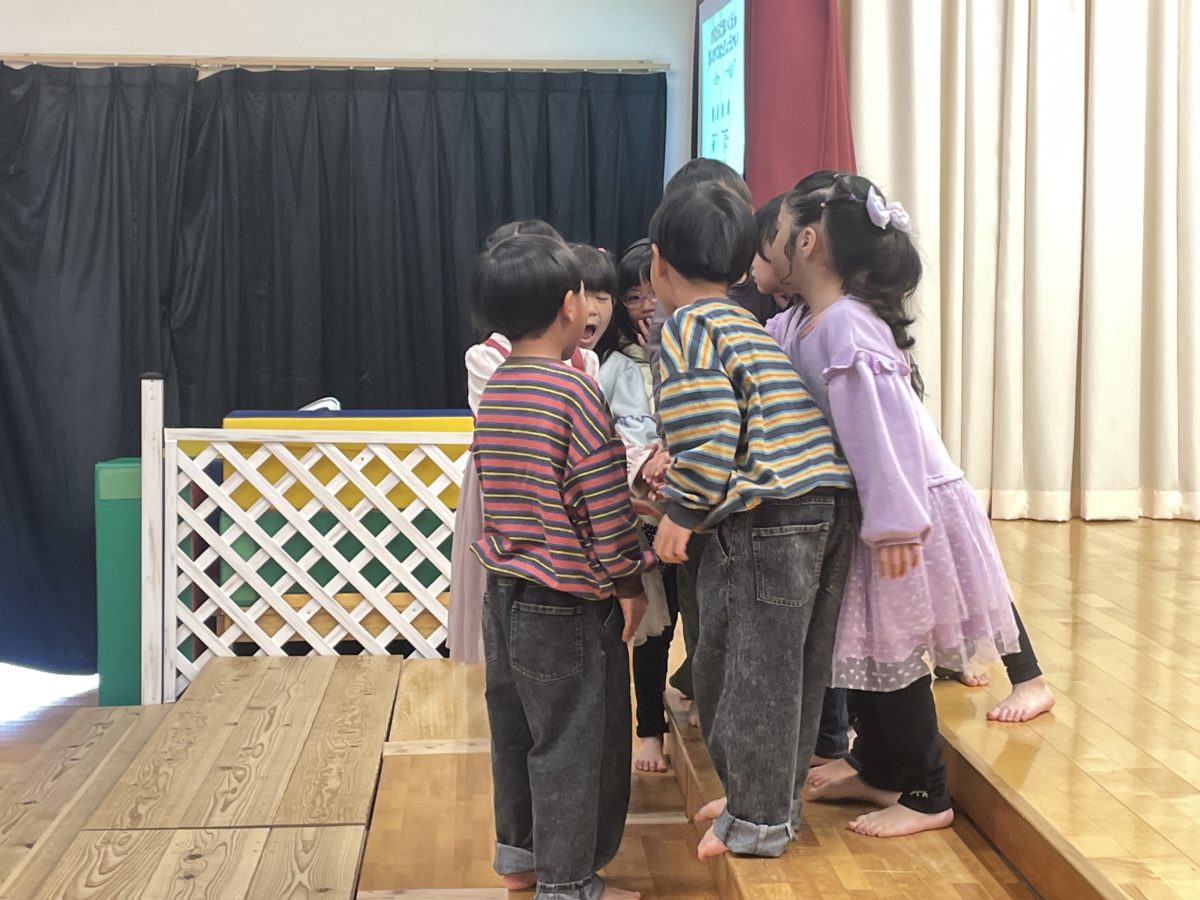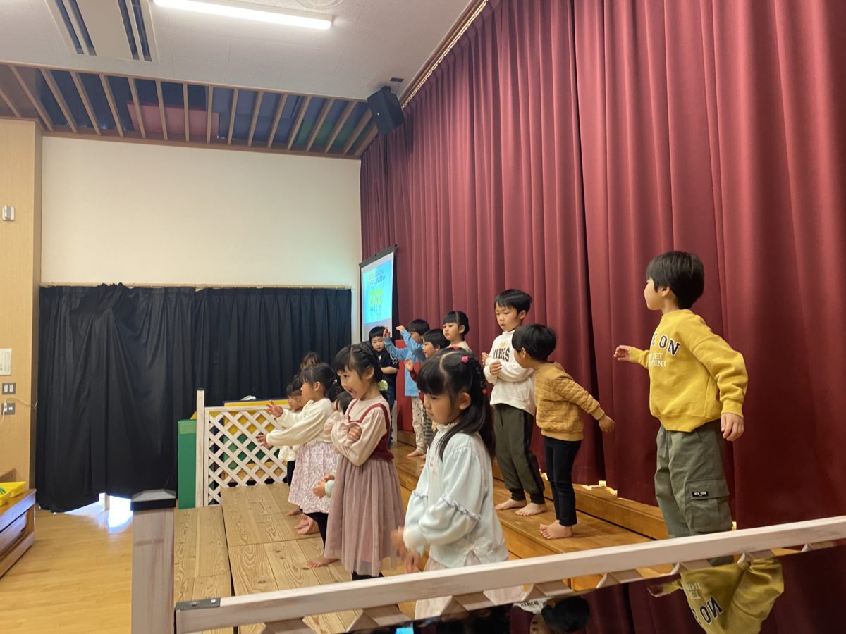 発表会を楽しみに待っていた子ども達。「きょうは、はっぴょうかい!」「おかあさんくるで!」「きんちょうしてきた・・!」とドキドキワクワクしていました。中には、いつもと違う雰囲気で涙ぐむ様子もありましたが、気持ちが少し落ち着くと好きな歌や知っているダンスを披露する姿がありました。大きい子は小さい子が困っていると「しまるよ!こっち!こっち!」と声を掛けたり、ティッシュを差し出してあげたりと優しい一面も見られました。さくらんぼ、ばなな、めろん組さんによるグループ発表では、「なにがながれるかな?」と曲が決まっていない中でも、「これおどれるよ!」と自信満々に踊る姿や分からない歌、曲でも周りのお友だちを見ながら真剣な表情で取り組む姿がありました。
