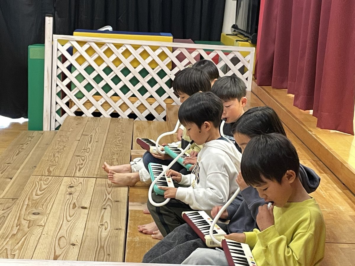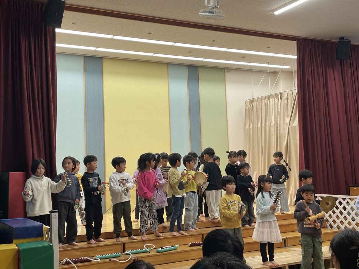 めろん組は「げきしたい!」「もっとダンスしたい!」「ピアニカしたい!」とそれぞれやりたい事に挑戦していました。ピアニカチームさんは毎日色々な曲に挑戦し、お友だちと教え合うことで、弾ける曲がどんどん増えていました。本番も前奏を聞いて曲のスタンバイをする素敵な姿がありました。劇チームさんは役になりきりながらも力強くかぶを引っ張ったり「えいえいおー!」とみんなと協力する場面があったりと工夫しながら劇を盛り上げていました。ダンスチームさんは鈴を持って踊ったり舞台を大きく使ったりと動きのあるかっこいい踊りを見せてくれました。全員での合奏では、誰が何の楽器を持つか決めずに自分達で選べるような環境でスタートしました。合奏をしていく中で、言い合いになってしまうこともありましたが、話し合いをしていくことで「おおきいがっきとちいさいがっきでこうかんしよ?」と自分達で提案しながら取り組んでいました。本番でも様々なハプニングがありましたが、自分達で考えて行動する姿が増えてきて、またひとつ成長したことと思います。頑張るめろん組さんの姿に憧れを持ち、ばなな、さくらんぼぐみさんもどんどんやりたいことが増えていく姿が楽しみです。最後まで、温かく見守っていただきありがとうございました。