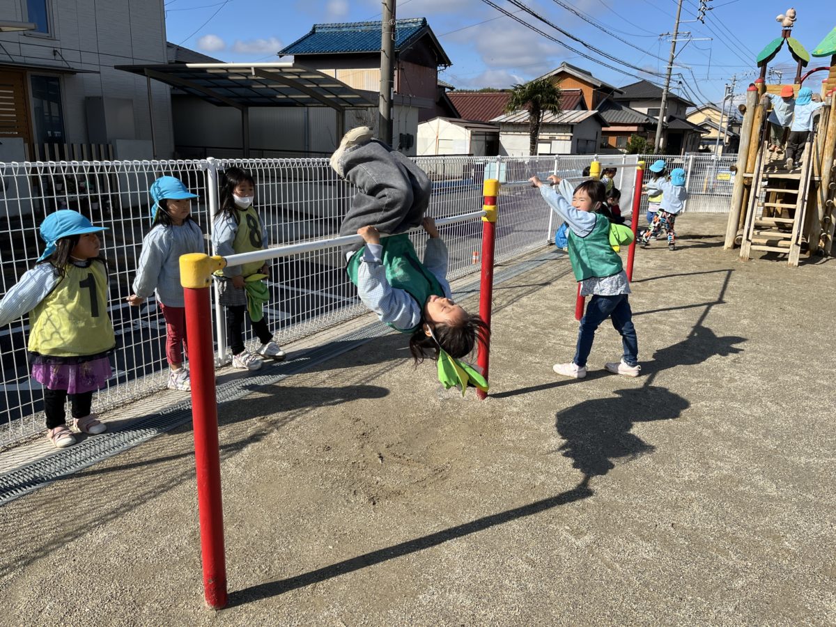 こちらは逆上がりに挑戦!逆上がりから前回りと連続技も披露してくれる姿があり、そんなばなな組さんを真似をしてさくらんぼ組さんも「これできるよ!」と見せ合う姿がありました。