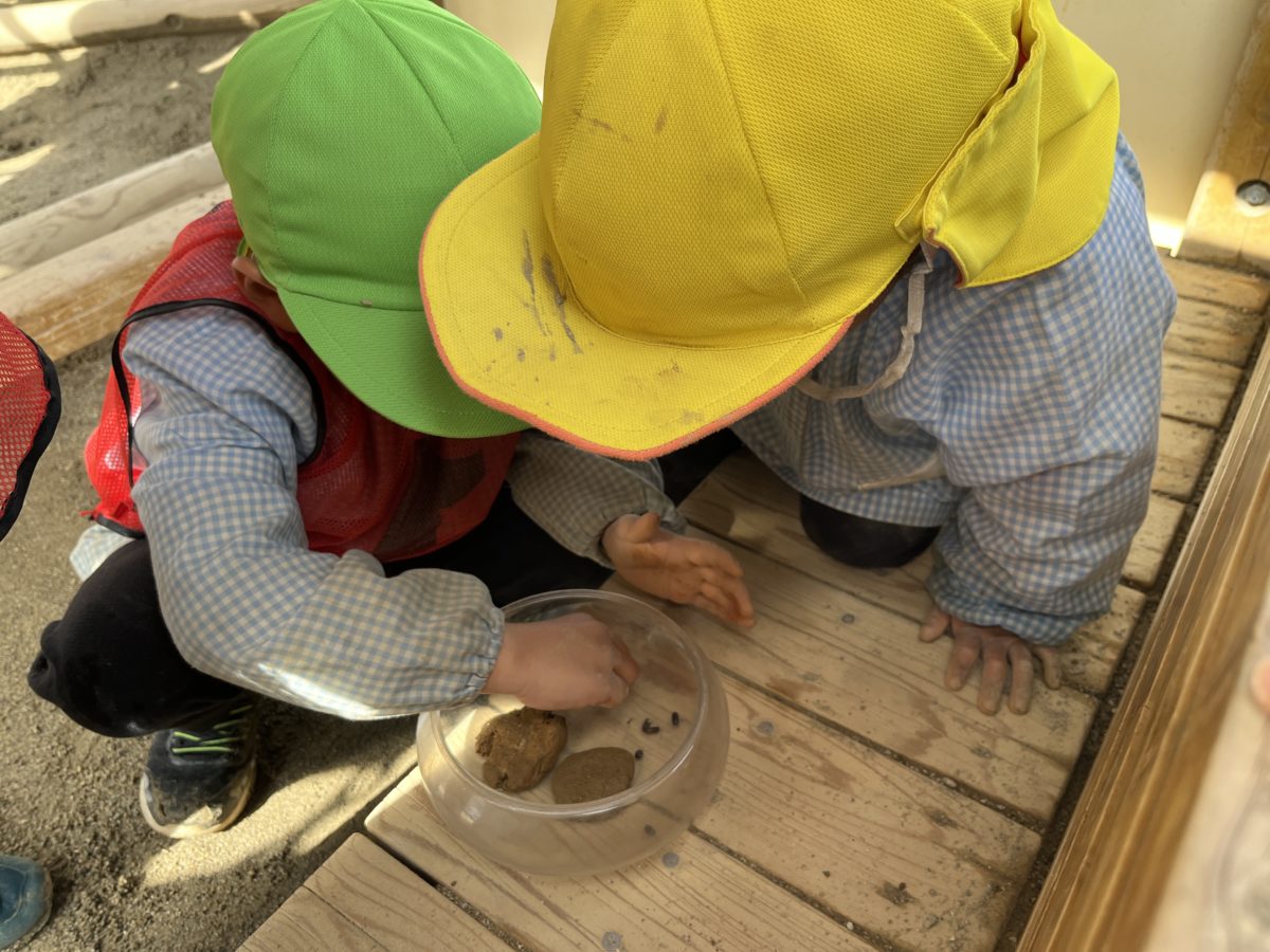 側溝にたまった砂を子どもたちと一緒に掘り出しているとそこからたくさんのダンゴムシを発見!掘り出すとどんどん出で来るので子どもたちも大興奮!ダンゴムシ探しに夢中になる姿がありました。両手いっぱいに捕まえたダンゴムシのために土でお家を作ってあげている子もいたり、透明の容器に入れて観察をしたり、ダンゴムシがすごしやすいように考えて葉っぱや土を入れて観察をする様子もありました。