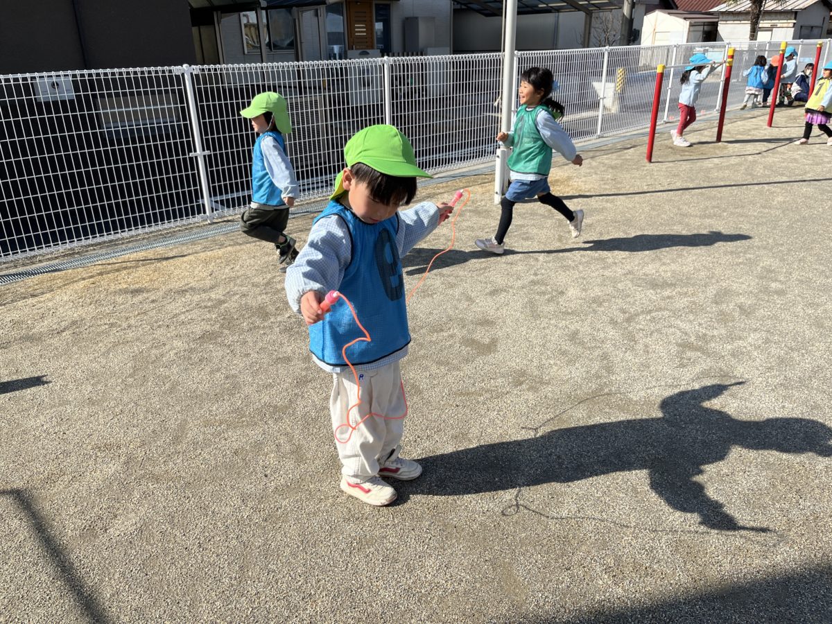 縄跳びに挑戦!持ち方は「こうかな?」と考えながらやってみる姿がありました。ふと下を見てみると自分の影の形が面白かったようで「へんなの~」と笑う姿がありました。