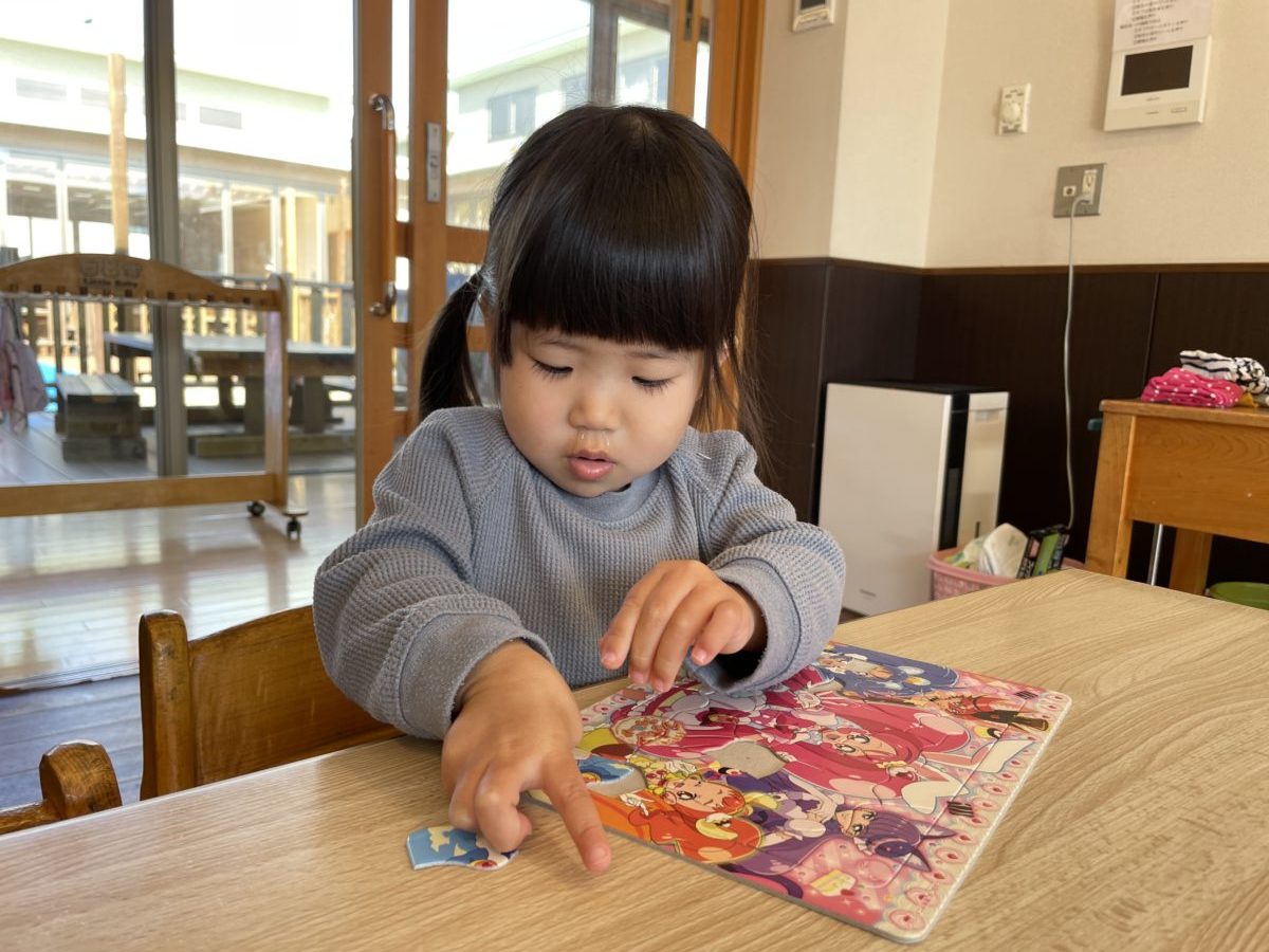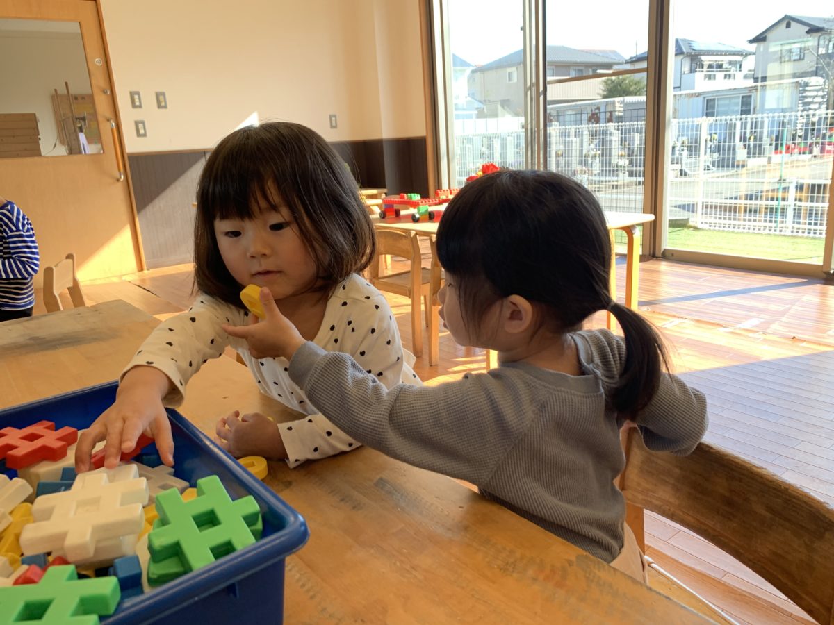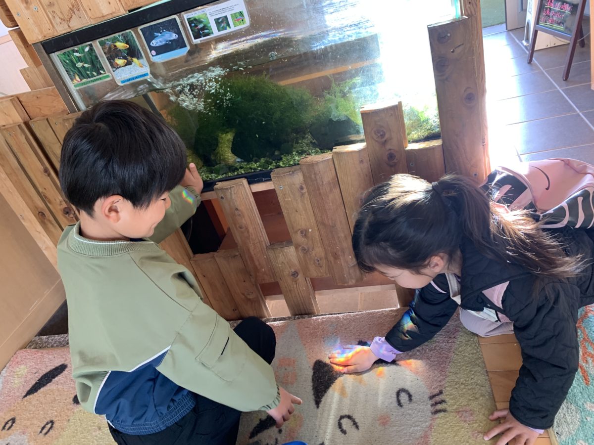 登園すると真っ先に目に入ったのはなんと虹色に光っている床!「なにこれ!」と虹色に光る床の正体は、直ぐ傍にあった大きな水槽によって反射したものでした。手にかざしてみたりと虹色に光る明かりに子どもたちは興味津々。暫く不思議そうに見ていました。お部屋ではブロックやパズルなどそれぞれ好きな遊びに夢中なようです。小さいお友だちは大きいお友だちの姿を真似て「○○ちゃんもやる」と小さいピースの多いパズルに挑戦中。「○○ちゃんできるよ」とお姉さんがやる姿を見ながら、一生懸命1ピースずつはめていくと・・・「できたよー!」とパズルが完成!「ちがうのやる」「これむずかしいね」と言いながらも何種類ものパズルに挑戦していました。