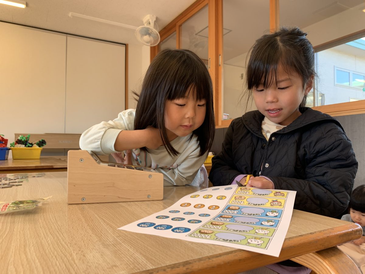別の場所ではばななくみさんとめろんぐみさんがブロックに夢中な様子。「ここはこうするの」「○○ちゃんこっちね」「こうしたほうがいいんじゃない?」と何やら相談しながら作っています。「ここをこうしてできた!」と完成したのは大きな家。ブロックの板を使いお友だちと作った物を繋ぎ合わせると、小さかった家も大豪邸に。「かわいいおうちできたよ」「こっちからはいるんだよ~」ととっても素敵な家が出来上がっていました。お友だちと会話をしながらブロック遊びをしてる中、この間めろんぐみさんが遠足に行った水族館の話が聞こえてきました。「あざらしみたんだよ」「○○ちゃんもすいぞくかんいったことある!」と何やら楽しそうな会話が次々に聞こえてきます。そんな様子から、海の生き物のカードを置いてみる事に。「これおったよ!」「あ!これみたことあるー!」と海の生き物に興味津々。更にこっそり別の場所では紙や色鉛筆等も置いてみると・・・「かきたいー!」とカードと睨めっこ。真剣にカードを見ながら紙に絵を描いていくと「さかなできた!」「ちんあなごもおるよ!」と可愛らしい海の生き物たちが出来上がっていました。