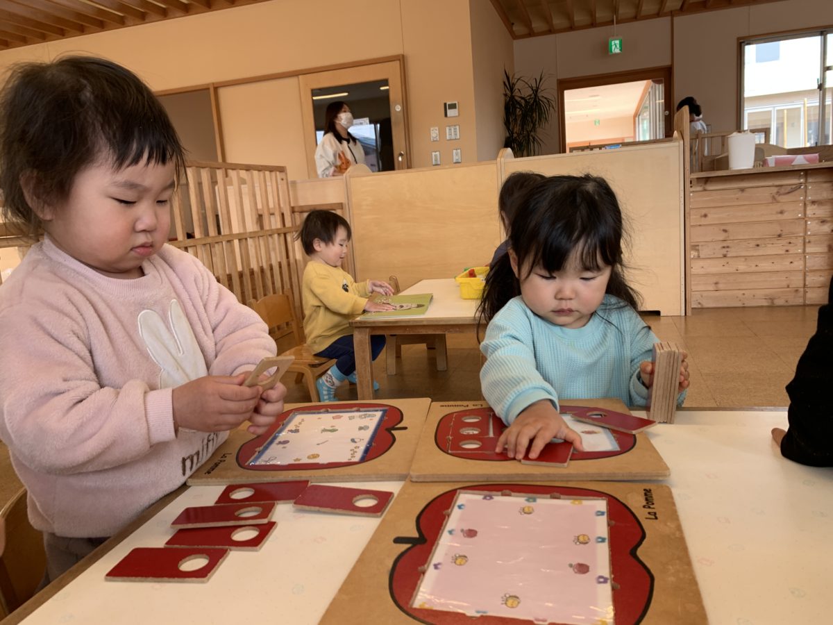 おままごとをして楽しんでいたのでレジのおもちゃをそっと置いておくと「ぴっぴってやりたい!」とすぐに興味を示してボタンをピッと楽しんでいました。途中でレジの引き出しに気づき、開けてみると・・・・「おかねはいっとる!」とおもちゃのお金を発見!レジのカード入れに通してスキャンの真似をしたり、「ぱんどうぞ!」「おかねもどうぞ!」と商品と一緒にお金も渡してくれる、なんとも気前がいいお店やさんも開店し、「なすもあるよ!」「これどうぞ~」とお買い物ごっこ遊びを楽しんでいました。、普段お買い物で耳にしている言葉をなんとなく真似して遊びに取り込む子ども達の姿がなんともかわいらしかったです。
