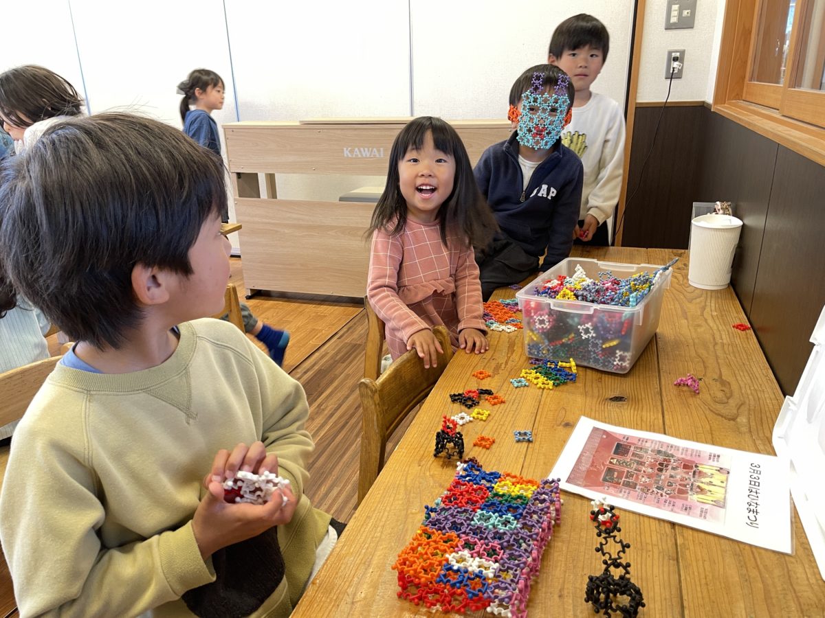 今日はひなまつり!絵本でひなまつりのお話を読むと、「あれ?これお家にもあるし、保育園にもあるよ!」と話していた後、お部屋に飾ってある雛人形を眺める子ども達。『うれしいひなまつり』の童謡を流すと、歌の歌詞をしっかり聞きながら、「ここにおはなあるよ!これうめのはな?」「おひなさまとおだいりさまはわかるよ!」と1つずつ確認しながら雛人形の鑑賞を楽しんでいました。めろん組のお友だちは雛人形を見ながら、「おひなさまとおだいりさまをつくるんや~!」と言いながら本物の雛人形と見比べ、えぼしから順番に作っていました。そんな姿を見て、刺激を受けたのか、他にも黙々と他の物を作る姿が。出来上がるとその作った物を普通に付けて他の物を作る姿があり、何気なく顔を上げた時に、インパクトがあり、みんなで二度見、大笑いをしてしまいました。力作の鬼のお面が顔にとてもフィットしていて、その後も他のお友だちが同じように作りたくなるくらいの大人気になりました。