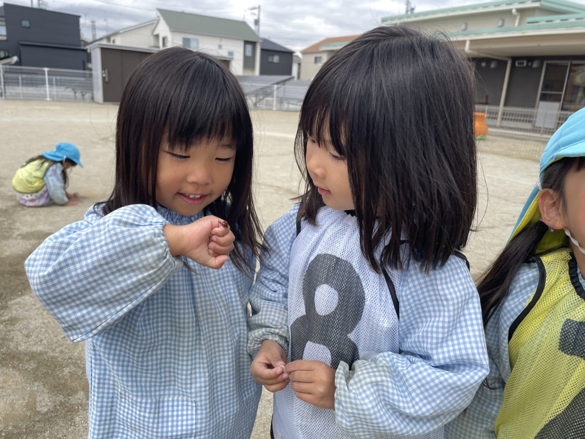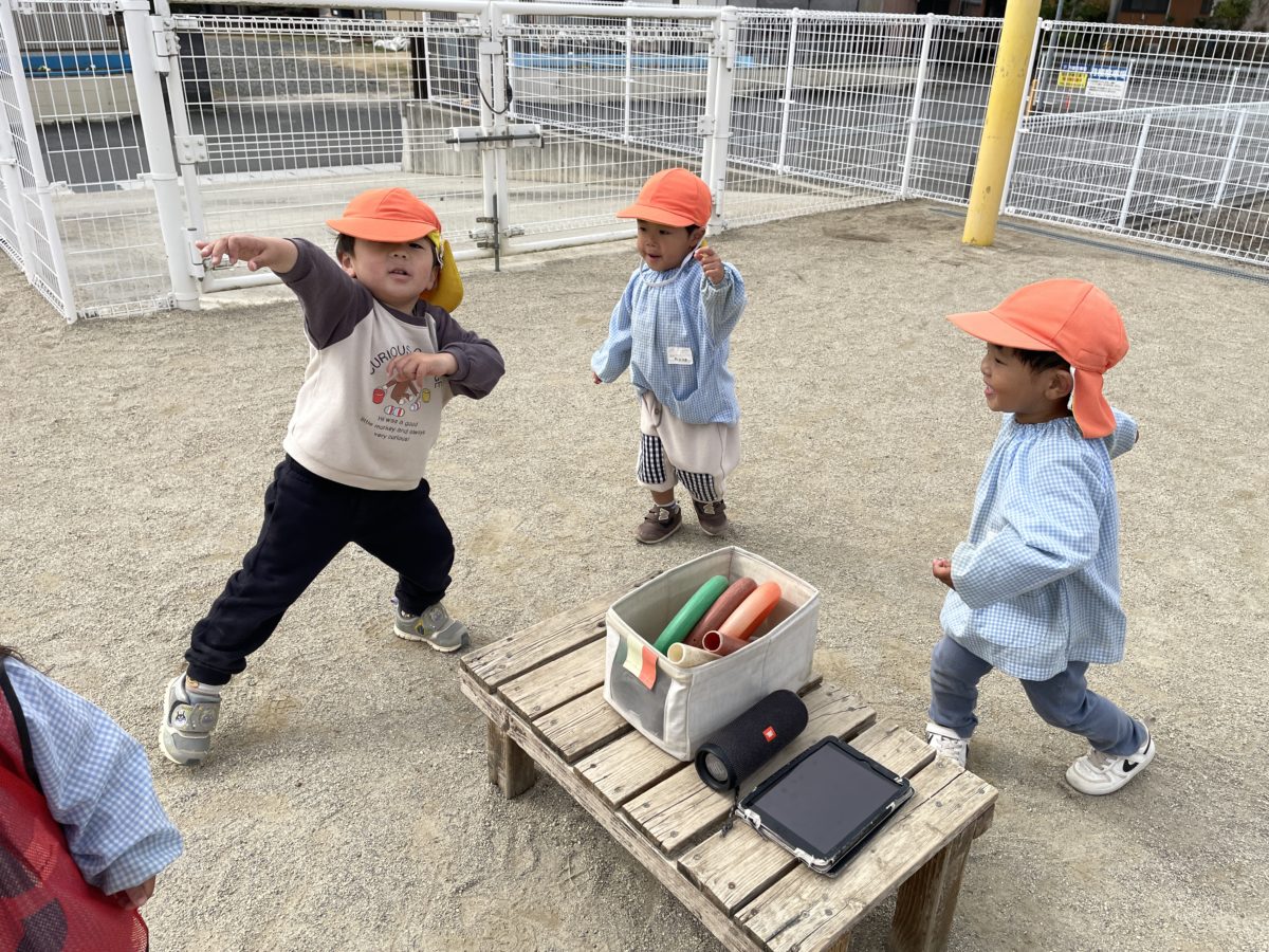 めろん組さんがピアニカを演奏しているのを見ていたばなな組さん、今日、めろん組さんのピアニカのホースと一緒にばなな組さんのも置いておくと「やってみたい!!」「わたし、めろんぐみさんがやってたのみてたからおぼえてる。」と自分のピアニカホースを探し出し、弾き始め「かえるのうたひいてみよ。」と早速演奏する姿があり横にいたお友だちもビックリした表情で「えっ?すごいな。おしえて~」とお友だちにドレミで教える姿までありました。園庭では、遊んでいるとたまたまてんとう虫が自分の手のひらにとまり「うわ!てんとうむしがきた。」とお友だちと一緒に観察。すると「あっ。てんとうむしがはねひろげた。もうすぐとんでっちゃう。」と言った瞬間にてんとう虫は飛び立っていき「ばいばーい」とてんとう虫が飛んで行った方向に向かって手を振るさくらんぼ組さん。また大きい子が踊っていたダンスの曲が流れてくるとスピーカーの近くに集まり出し、踊り出したりんご組さん。大きい子が踊っている姿をたくさん見てきたこともあり、リズムに合わせてお友だちと元気いっぱいに踊る姿なども見られるようになってきました。めろん組さんは園庭に描いてあった渦巻きを見て「りょうほうのはしから走ってきてじゃんけんするやつしよ~!」と自分たちで遊びを展開させて楽しむ姿がも見られました。