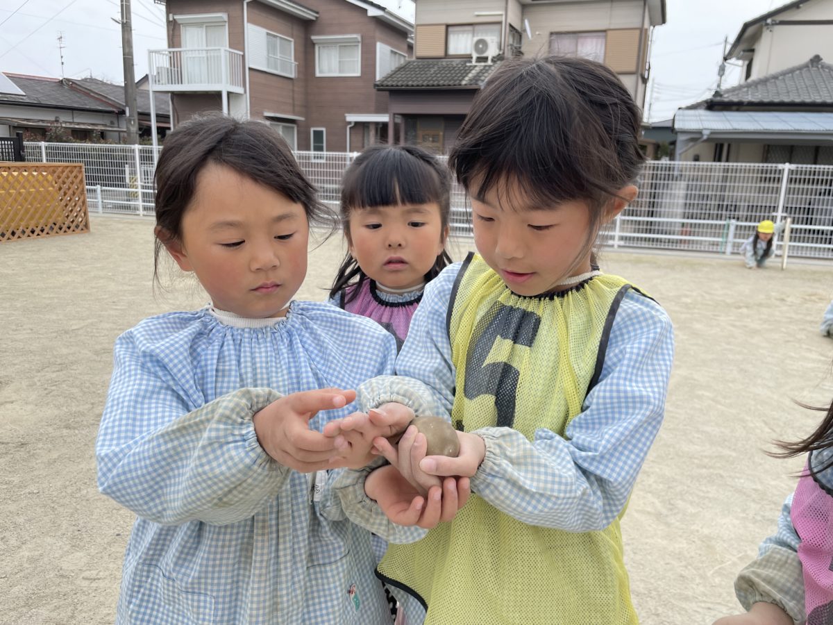 今日も午前中からお団子作りに夢中の子どもたち。自分で一から形を整え大事に大事に磨き、「見てみて!ピカピカのおだんご出来た!」と大喜び!そのピカピカのお団子を見ながら憧れの眼差しで、「どうやったらピカピカになるの?」「どうやって作ったん?」とみんながコツを聞きたくて興味津々!「とにかくずっと白い砂をかけて、ずっと磨いてたよ!」と答えると誰もが自分の持っていたお団子を一生懸命に磨き上げる姿がありました。他にも置いてある机にサラサラの砂を沢山集めそこで優しくお団子を転がしながら形を整えていたりする新たな技を使う子なども居て、各々に自分たちで色々と考えながらお団子作りを楽しむ姿がありました。