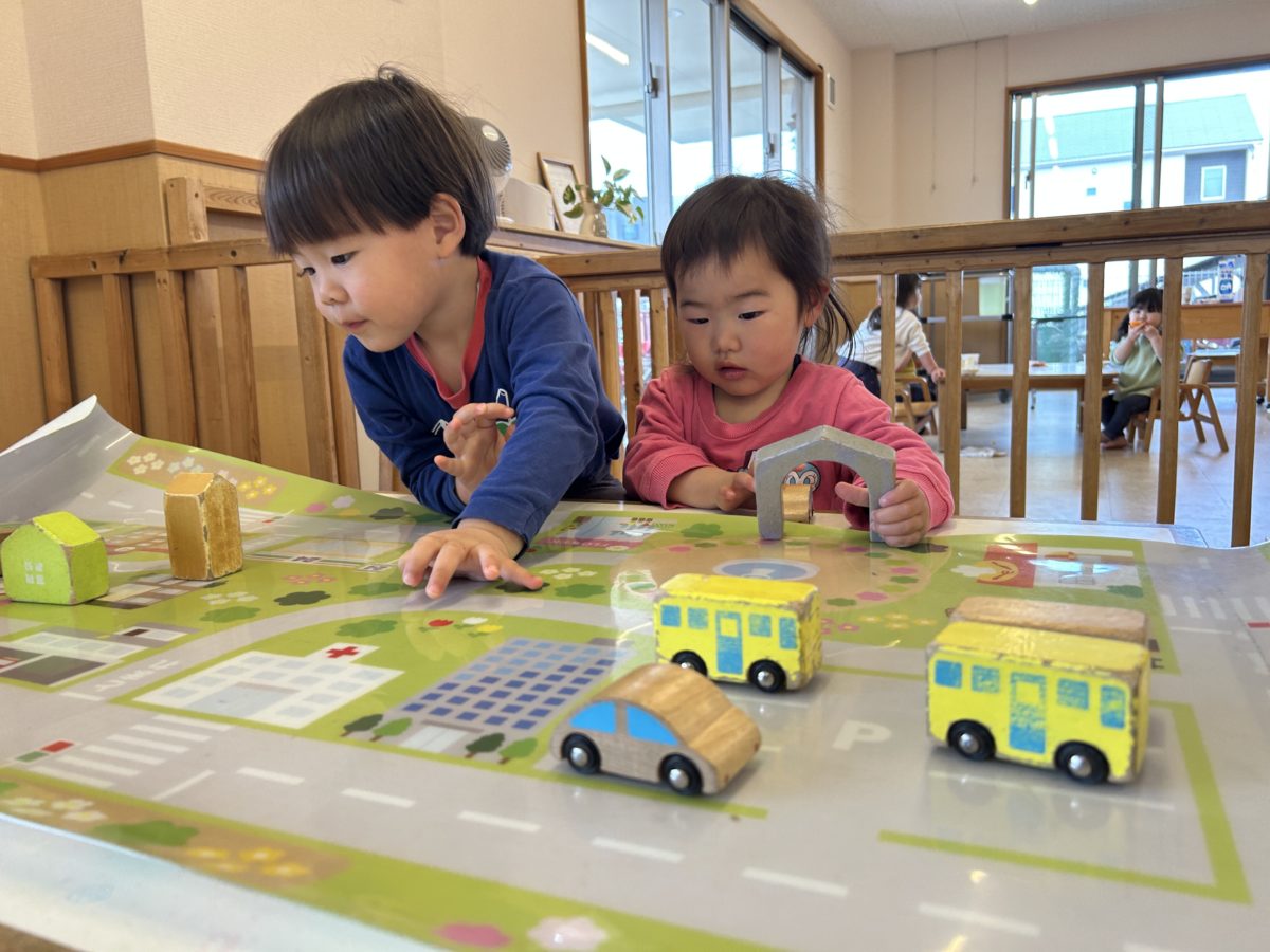 「ぶっぶー。ぶっぶー。」と車をマットの上で走らせています。