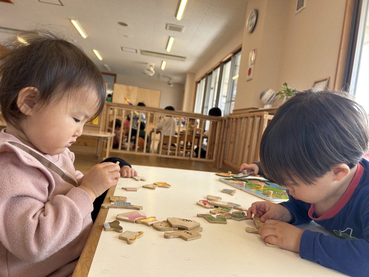 動物カードを使ってクイズをしていると、「それ、ぞうさん!ぱおーん。」「つぎはライオンさん。らいおんさん、がおー!!」と子どもたちはそれぞれの動物になりきっているように鳴き声の真似をしたり動きの真似をしていました。すると「らいおんさんはつよいんやで!がおー!ってなくんやで~。」「なー。」とお友だちと会話の中で共感しあっている様子も見られました。また積み木を使って高く高く積みあげることに挑戦!!手を伸ばして…そーっと!そーっと!!多く積みあがると思わず自分でパチパチと拍手をしたり「できたー!」と嬉しそうな顔をして喜ぶ姿なども見られました。またすいか組のお友だちもそれを真似て…そーっとそーっと何個かの積み木を積めるようになり楽しんでいる様子がありました。それぞれの年齢で器用に積み木を積めるようになってきました。そして園内の散策へ行くと「なんかいいにおいしてきた~」と子どもたちが匂いにつられたどり着いた場所は給食室。給食室を覗きながら「きょうのごはんなにかな?」「おなかすいてきたな~」「ここからいいにおいがしていたんだね!」と会話で盛り上がりを見せる姿がありました。