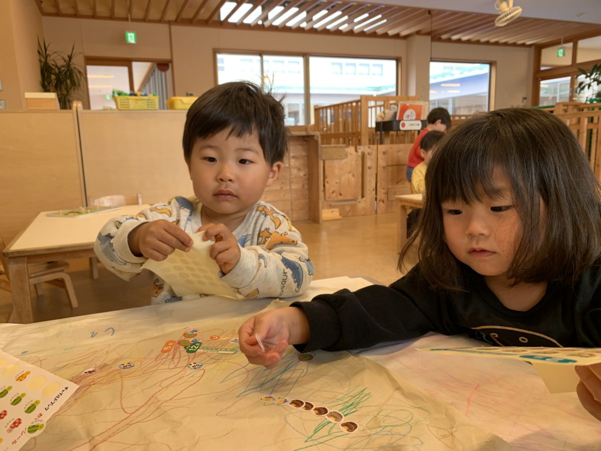 別の場所ではクレヨンやシールと一緒に大きな紙を準備してみると「うわぁ~!おっきいね~!」とびっくりした表情を見せながら、シール貼りに挑戦!シールを一列に丁寧に並べて貼っていったり、「まるまる~!」と言いながら大きな丸を描いたりと自由にお絵描きやシール貼りを楽しんでいました。