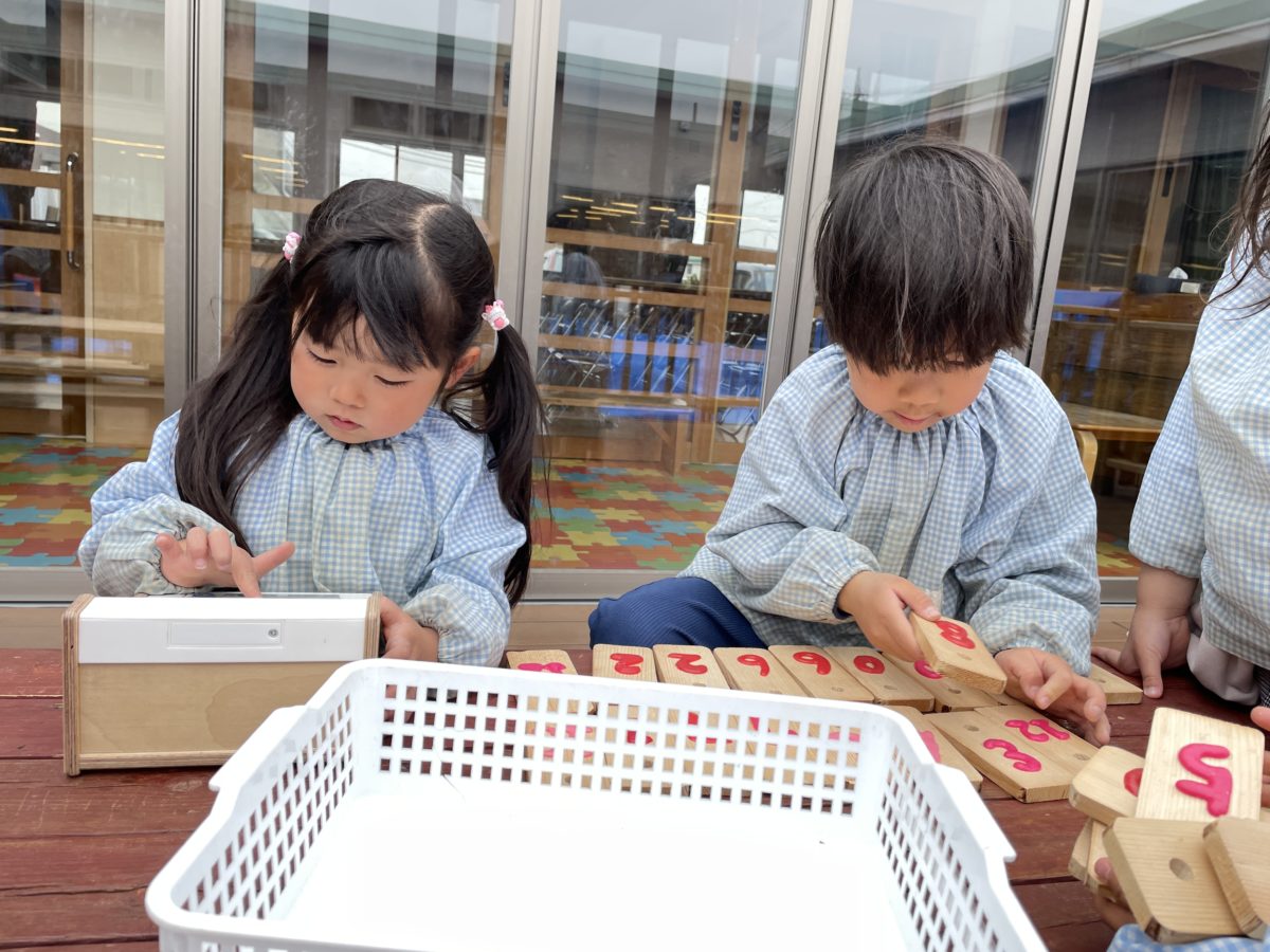 別の場所では、以前数字に興味を示す様子から数字の木製プレートやレジスター時計等、数字に関する物を置いてみる事に。「これなに?」と不思議そうに手に取ると机の上に数字順に並べ始めたり、数字同士を足して足し算に挑戦するお友だちなどなど。子どもたち同士で工夫しながら遊びを展開させて楽しんでいました。
