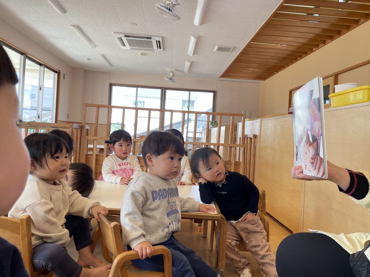 室内では、虫さんと食べ物の大型絵本に興味津々の様子。虫さんの大型絵本では「てんとうむしおった」「くわがたかな?」と出てくる虫さんを指さして話していたり、カマキリを見て「これなに?」と不思議そうに見つめながら言うお友だちに「かまきり、だよ」と教えていました。食べ物の大型絵本では「ケーキ!」「○○ちゃんケーキ食べた!」「これパンだよ!」「パン食べてきた!」と自分の食べたものや好きな食べ物について楽しくお話していました。