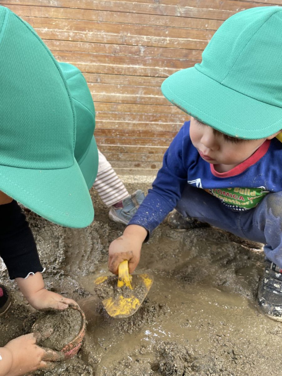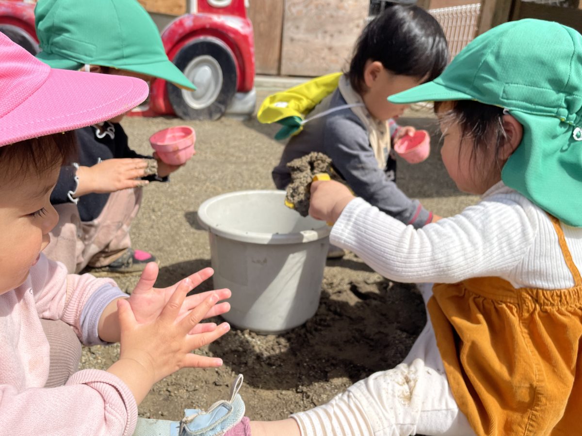 午前のおやつが終わると窓へ近寄っていき「そと!そと!」指をさして言う子ども達。そんな様子から戸外へ出ると、さっそく自分の靴を見つけて履いたり、帽子を被って準備万端!土が湿っていたので子ども達もつかみやすかったのか、手で土をつかんでみたり、たくさん集めておおきいお山を作って遊んでいました。「あ!」バケツが置いてあるのを見つけたお友だちが「これこれ!」とバケツを持ってきてくれました。その声に反応した子どもたちも集まってきて「ここ!ここ!」とみんなで一緒に土を入れ始めました。バケツに土がたくさんたまると、「ポンっ!」。バケツをひっくり返して大きなお山の完成!「おっきい!」「できた!」と嬉しそうな子ども達でした。一方で別の場所では、大きい組のお兄さんたちが「はい!」と言って渡してくれたのは、どろだんご。両手を合わせて嬉しそうに受け取ると、「みて!」とお友だちに見せに行く姿がありました。