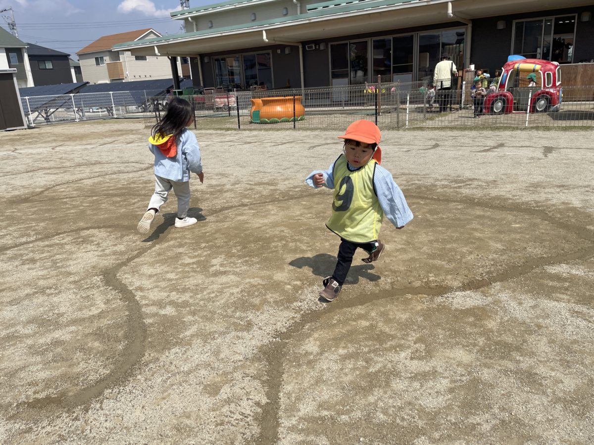 「ガタンゴトン!」「はやいんだよ~」地面に引いてある線に沿って電車になりきって走っていました。