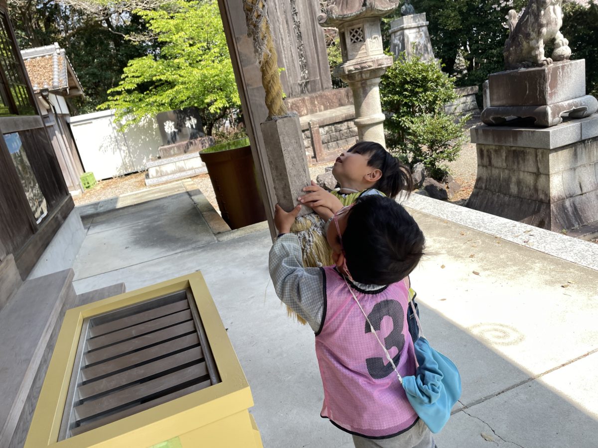 神社に参拝に行き、お兄さんたちが鈴を鳴らしているのを見てばなな組とさくらんぼ組さんも「ガラガラ~」とゆすって手を合わせて参拝をしていましたよ。