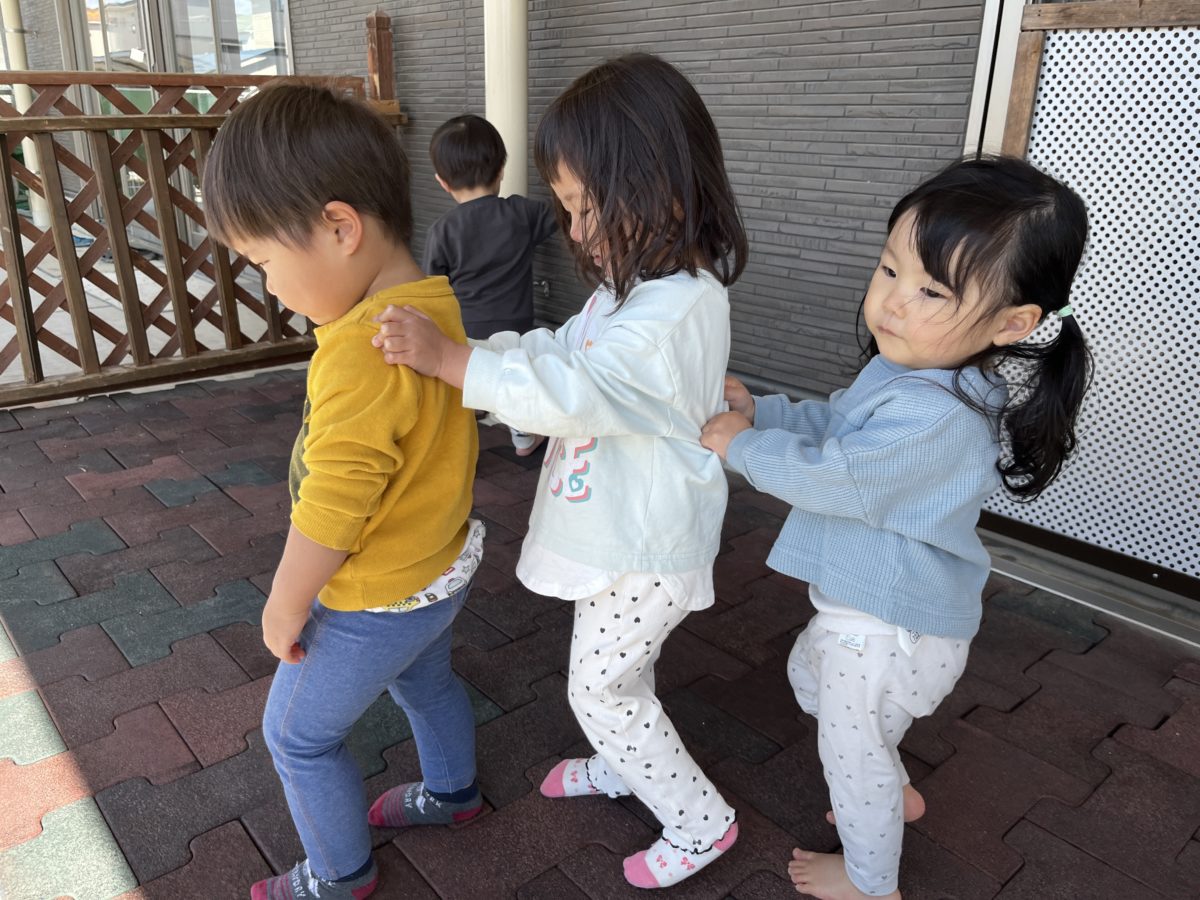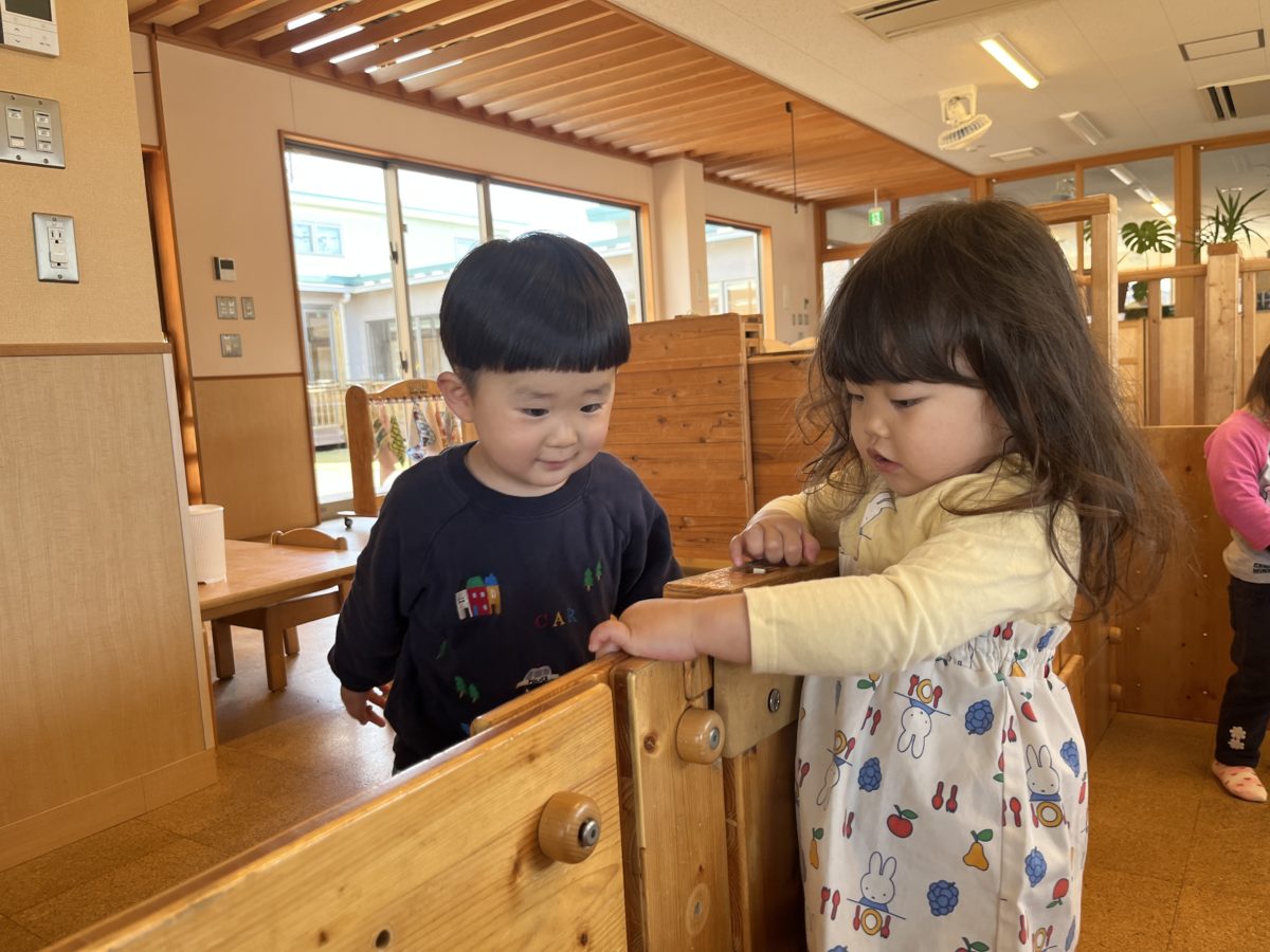 1つ大きなクラスになった子ども達。登園してくるとロッカーに自分のカバンを入れますが、「ない!」「かばん(いれるとこ)どこ?」とロッカーを探していました。大きい組のお兄さんたちが「ここやで!」とロッカーの場所を教えてくれましたが、ロッカーの場所も形も変わったりんご組さんは「ここ?」と不思議そうな顔を浮かべていました。カバンからタオルを取り、「あった!」と自分のマークを見つけると輪っかに紐をかけ、朝の準備ができるとお部屋へ向かいます。ですが今日は、お部屋が変わっているのに気づき最初は「なんか違うなあ」と不思議そうな顔でゆっくり近づいていく子どもたちでしたが、お部屋に入ると「つくえ、おおきいね!」と嬉しそうに話したり、少し椅子が大きくなったので足をぺたぺたさせて遊んでいました。