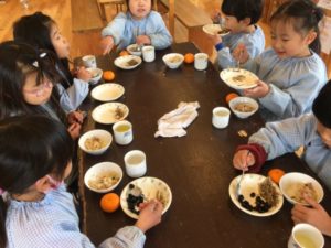 給食が<七草がゆ・黒豆・たつくり>のメニューでした。「あーこれ、おしょうがつにたべた!」「このおさかなすきなやつ!」とモリモリ食べる子どもたち。「おいしいね!」「おかわりしよっと」とみんなお腹いっぱいお正月メニューを味わいました。