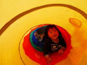 すいか組のお部屋ではトンネル遊びをしました。みんな興味津々でした。でも、まだ怖くてなかなか入れないでいると、月齢の大きい子が何度も潜って楽しそうに出てくるので、後ろからそーっと覗いてみました。すると、トンネルの向こうに保育士がいるのを見つけてびっくり!何度も嬉しそうに覗いていましたよ。