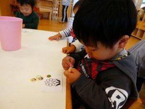 シール貼り、細かい作業も上手にできるようになりましたね。いちごさんは次々に貼っていき、もっとシールちょうだい、と言ってきていました。今日は、すいかさんが興味を示し、座りに来ていました。でも、なかなかシールがはがれずに悪戦苦闘していました。一つ貼れると「できたー」と見せてくれる子もいましたよ。