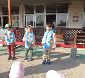 先日、11月の誕生日のお友だちのお誕生会を外で行ないました。「お名前は?」「11月の何日に生まれましたか?」と質問すると、少し照れたり、嬉しそうにしながら答えていました。他のお友だちは「おたんじょうびのうた」を歌って沢山の拍手を贈りお祝いしました。