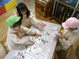 お部屋に交通かるたが用意してあります。かるたのやりたい子達で集まって取り札を並べていきました。札を読める子が文を読んでいき、見つけたお友だちが取っていきます。上手に取れると嬉しそうにしています。
