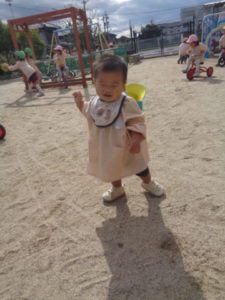 0歳児のKくんは押し車を使わなくても歩くことができるようになってきました。自分の足で行きたいところへトコトコ。興味のある物がいっぱいあり、歩くのがとっても楽しそうです!!