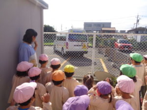 昭和37年に四日市で初めてのスクールバスとして運行しました。当時の市長さんに来て頂き、出発式を行ないました。毎日子ども達を送迎してくれていましたが、だんだんと自家用車で送迎する方が増え、バス利用する子が少なくなり、残念ではありますが、バスとお別れすることになりました。業者の人に引き取ってもらうのを手を振ってみんなで見送りました。「また乗せてねー!」「僕も乗りたかったー!」と友だち同士で話をしていました。