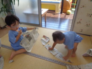 お部屋に新聞紙を用意しました。新聞紙を手に取ると縦や横など色々な方向にビリビリ破いていきました。大きい子は破いた新聞紙を丸めてボールを作って小さい組の子と転がして遊びました。