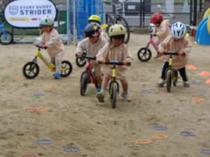 ストライダーのブレーキの練習もしました。先生の掛け声に合わせて、ブレーキを使って動いたり止まったり。そのあとは、バランスが取れるように両足を浮かせて走りました。中には、ペダルを漕いで進むことができる子もいました!