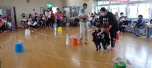 2歳児クラスはアンパンマンのブロック合わせです。顔と体を選んで保護者の元へ持って行きます。運ぶのがとても大変そうでしたが、持っていけると嬉しそうにしていたり、上手くブロックが合わせられると周りからも「おぉー!」という声も上がってとても盛り上がりました。