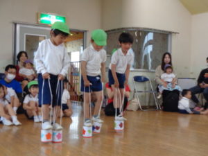 3・4・5歳児は缶ぽっくりした後、サイコロの出た目の動物のお面を取り、大きな草履を履いて保護者と二人三脚という競技をしました。園庭にいるときに遊んでいたので缶ぽっくりもみんなとっても上手でした。保護者と呼吸を合わせるのは難しそうでしたがみんな楽しそうにしていました。