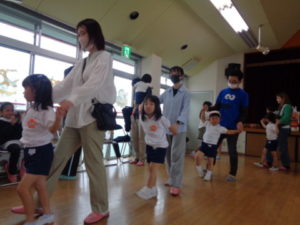 競技の後はフォークダンスをしました。子ども達にとってはおなじみの『オクラホマ・ミクサー』で保護者と手をつないで恥ずかしそうに踊っている子や嬉しそうにしている子など様々な姿が見られました。
