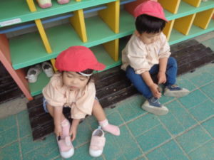 1歳児も出来る事が増えてきました。靴を履いているときの場面です。保育士が手を貸さずともマジックテープを剥がして足を入れていました。少し時間はかかりますが頑張って履いています。