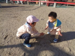 0歳児のお友だちが園庭で転んでしまいました。すると大きい子が助けに来てくれました。「大丈夫?」と手を貸してあげると0歳の子も泣かずに立ち上がり、また歩いていきました。