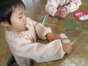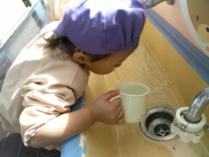 寒い日が続き、風邪を引かないようにお外から帰ってきたら手洗い・うがいをします。2歳児の子も以前は上手く「ぐちゅぐちゅぺっ」が出来ず服を濡らしてしまう子もいましたが、今ではみんな上手にうがいをしています!!