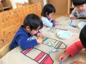 朝から「どんないろ~がすき?きいろ!」と元気いっぱいの歌が聞こえてきました。お部屋に飾ってあった色のカードをじっと見ながら色に夢中な様子です。”どんないろがすき”の音楽を流してみると、音楽に合わせてとっても楽しそうに何度も歌っていました。そんな姿から、クレヨンの塗り絵にこっそり色を塗っていると…「わぁ~なになに?」「○○ちゃんにもみせて」と机に集まってきました。「つぎはなにいろかな?」「あかじゃない?」「ちがうよオレンジだよ」と次々に塗られていくクレヨンのイラストを真剣に見ていました。全て塗り終わると「ぼくあおがいい!」「○○ちゃんはピンクがいいの~」と好きな色のクレヨンのイラストを取り、「みてみてこれいっしょのいろだよ!」と、色の表と照らし合わせてみたりしながら次々に遊びを展開させていました。そんな中、「ぬりぬりぼくもしたい!」「○○ちゃんもする!」と子どもたちの声から大きな紙にクレヨンのイラストを描いた物と、クレヨン・絵の具・色鉛筆などを机に準備してみる事に。「わぁ~やった!」と、早速好きな色を手に取り、「きいろとみずいろのくれよんつくるの」と真剣に色を塗り始めていました。「○○ちゃんはピンクにする」と1つの大きなクレヨンを皆で塗り進めていきました。「みてー!できた!」ととってもカラフルなクレヨンが出来上がっていました。