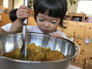園周辺施設の写真をラミネートし、カードにした物や園周辺施設が載っている地図を用意してみると・・・子どもたちから「ここいきたいの~!」「ぼーぼーしゃいきたいね~」「ぼーぼーしゃ、あるかな~?」「すべるーだい、いこ!」こんな声が聞こえて来ました。子どもたちのこんな声から園外へ出掛ける用意を始めてみる事に。園周辺施設の写真カードを手に持ち、お友だちと手を繋いで準備万端。さぁ!出発!歩き進めていくと消防署が見えてきました。子どもたちから「あれ?いない」「どこにいったんだろうね~?」「どうしよう?」と。消防指揮者が1台お出掛けしているようです。いつも停まっている消防車がいない事に気が付いた様でした。とてもよく見ていますね。更に歩き進めていくと坂道を発見!坂道を登ってみることに。バランスを取りながら子どもたちは駆け上がっていました。坂道を登り切ると大きな遊具が見えてきました。「やったー!」みんな大喜びです。大きな遊具、子どもたちはいとも簡単に登っていきます。大人が「だいじょうぶ?」「あぶないよ」などと言わなくても子どもたちは1度挑戦してみて、こわいな・・・、できないな・・・と感じたら戻って来ています。そんな姿にとても驚かされますよね。子どもたちは自分で体験をし、感じた事が次へと繋がっていくのでしょう。このような姿からとても成長を感じます。じっくり、ゆったりと子どもたちの姿を見守って行きたいと思います。子どもたちが掘ったサツマイモ。新聞紙を巻き、水に浸し、アルミホイルを巻いて給食の先生に焼いて頂きました。焼き上がったサツマイモを潰して茶巾絞りに。ギュッと握るのを楽しみ、握ったサツマイモの茶巾絞りをパクッ!子どもたちから「おいし~!」と言う声と共に笑みがこぼれていました。みんなで掘ったサツマイモ完売です。