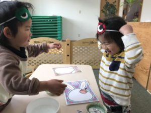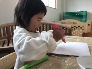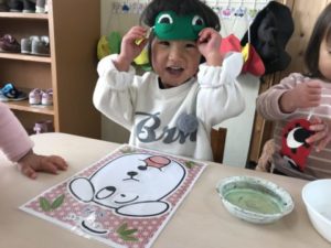 保育室に掲示してある凧を見て、「なんだあれ~?」と興味を示していた子どもたち。そこで他にもお正月に関する物の写真を掲示してみました。「うわ~いっぱいある!」とお友だちと一緒に机の上に並べて、覗き込んで見ていました。獅子舞の写真を見て「なにこれ、こわい!」と言ってみたり、おせちの写真を見て「これおばあちゃんのおうちでたべたよ!」と教えてくれたりする姿もありました。そんな中でも1番興味を示していたのは・・・あんぱんまんの凧です。掲示してある写真を見て、「あ!これあっちにあるよ!」保育室にも同じ物が飾ってある事に気付きます。他にも様々な種類の凧を見て「これもあんぱんまんといっしょだよ!」と釘付けです。そんな姿から、子どもたちの前で凧を作ってみることにしました。すると・・・「なにやってんの~?」と早速興味を示します。凧に絵を描いていくと「いいな~!」「○○ちゃんもやりた~い!」「○○ちゃんもかきかきほしい!」と早くやりたくて仕方が無い様子。ペンやシールを準備すると直ぐに真っ白だった凧がどんどん色鮮やかに、おしゃれになっていきます。ストローで裏面から支え、紐を通していざ園庭へ。紐をしっかりと握って思い切り走りますが・・・思うように凧が揚がりません。しかし直ぐには諦めません!後ろの凧を見ながら走り続けます。すると・・・少し上に凧が揚がりました。それを見て嬉しかったのか、「わあ!みて!」「すっご~い!できたよ!」と、しばらくの時間走り続けて凧揚げを楽しみました。最後の方にはコツも掴み腕を上げて、上手に凧を揚げることが出来ていました。