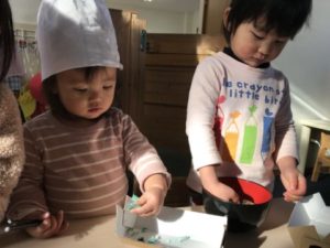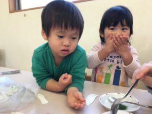 たこ焼きのメニュー表をおいて置くと・・・「うわぁ~!なんだこれ!」「たとやき!(たこやき)」と今日もたこ焼きに興味津々の様子です。そこで、フェルトで作ったたこ焼きやたこ焼きを入れる容器、お箸など様々なアイテムを準備してみました。メニュー表を見ながら「どれがいいかな~?」「〇〇ちゃんはこれがたべたいな~!」「これはネギがたくさんのってる!」と楽しそうな声が聞えてきます。そこで、ネギに見立てた紙をお椀に出してみると・・・たこ焼きの上にパラパラと乗せ、「はーいできた!」とたこ焼き屋さんになりきっていました。別の場所では、たこ焼きの塗り絵が盛り上がっていました。「ソースかけるね!」と色を塗ったり、シールをトッピング代わりにしてみたり・・・そこで鰹節やソース、マヨネーズの写真をラミネートした物を机にそっと置いてみると、すぐに手に取り塗り絵をしたたこ焼きの上でかける真似をして遊び始めました。そんな姿から、実際に本物を出してみようと思い準備していると・・・なんだ?なんだ?と様子を伺いに来た子どもたち。マヨネーズの存在に気付くと、にやりと笑い急いで手を洗いに行きました。消毒もして準備万端です。まずは保育士が一口。「おいしい?」「え~いいな~!」「○○ちゃんもはやくたべたーい!」ともう待ちきれない様子です。早速スプーンを準備して試食開始!「なんかこれおいし~!」「なんかチーズのあじするよ!」「もっとたべたーい!」と嬉しそうな子どもたち。そんな中、1人のお友だちが、青のりと鰹節のパッケージを見つけ「これもたべたい」とリクエスト。「ここにのせて!」と皆手を出して待っています。「なんだこれ~!おいしっ!」と目を見開いて頬張っていました。食べ終えると、「じゃあつぎはこっちのおててね!」と、先程とは反対側の手を出してきて何度も食べている姿が可愛らしかったです。いつかトッピングだけでは無く、本物のたこ焼きと一緒に食べることが楽しみですね!