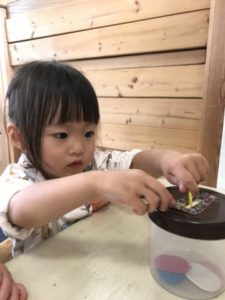 朝登園すると、大きいお友だちはシールが入っている木箱の中を覗きながら「どれにしようかな~」とシールを選び、おたより帳の今日の日付の所にシールをペタリ。そんな姿を傍で見ていた小さいお友だち。お友だちの真似をして手を伸ばすと、シールをお友だちのおたより帳に貼ろうとしていました。そんな姿から、別の場所にシールや紙を準備してみる事に。好きな柄のシールを手に取るとシール貼りに挑戦です。中々うまく台紙から剝がれないシールに苦戦しながら一生懸命剥がそうと真剣な表情。ふとした瞬間にシールを剥がす事が出来ると、手の甲や服などにぺたり!色々な所に張り付くシールが不思議な様子。何度も色々な所に貼り付けては外しを繰り返しながらシール遊びを楽しんでいました。