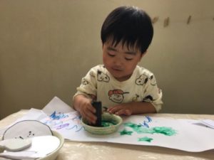 一方別の場所では「これ!おわけ(おばけ)!」と何やらおばけの絵本に夢中な様子。”おまつりおばけ””おばけだじょ””おばけのかわをむいたら”など保育園にはおばけの絵本が沢山あります。「これみる!」と子どもたちのリクエストから、それぞれの絵本を読んでみると「○○ちゃんこれ!」「しましまおばけ!」「あいしゅのおばばけ!」とカラフルなおばけたちや時にはちょっぴり怖そうなおばけなどなど。色々な形や色のおばけにすっかり夢中な様子。更におばけのイラストのカードも置いてみると、「びゅーん!」とおばけを高くあげ飛ばしながら楽しんでます。そんな様子から、おばけのイラストが描かれた紙やクレヨン・シール・はさみ・絵の具などを準備してみると早速好きなアイテムを手に取り遊ぶ子どもたち。2色のクレヨンを使い、ぐるぐると色を付けてみたり、黒のペンを使いおばけの形を描こうとしているお友だちなど・・・。机の上はカラフルなおばけたちでいっぱいになっていました。