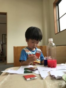 「りんご、りんご、りんごのほっぺ~♪」と手遊びをしてみると・・・子どもたちは大盛り上がり。「おくちはチェリー♪ちゅっ!!」っと投げキッス。子どもたちのこの姿がなんとも可愛らしく見ているこちらが幸せな気持ちになるのです。うどんの手遊びも人気で「チュルチュルもたべたいね~」っと言う2歳児。うどんの手遊びではきつねやたぬきの顔真似を全力で楽しんでいる子どもたち。この顔真似もとっても可愛いんです。手遊びを楽しんでいても救急車のサイレンが聞こえてくると・・・顔真似どころでは無いようです。救急車が通り過ぎ、子どもたちが机のあるところへ戻って来ました。「おうしょうしゃ(消防車)いきたいの」「〇〇ちゃんはきゅうきゅうしゃがいい!」子どもたちの熱量はまだまだ冷めやみそうには無いようです。子どもたちの熱い想いに応えてあげたく、いつもより大きな救急車のイラストを用意してみました。子どもたちの反応は「わぁ~!!おっき~い」と。「ちょうだい!」と手を出していたので大きな救急車のイラストを渡してみました。そこに色を塗ったり、シールを貼ったりとそれぞれに好きな物を選んで楽しんでいます。すると・・・1人の2歳児の子が「はしゃみ(ハサミ)ちょうだい!」ハサミのリクエストがありました。ハサミを渡すと器用にイラストを回しながら切っています。大きな救急車のイラストは大きくて切りづらいのですが、子どもたちなりに考えています。先ずは白い余白の部分を切り落とし、そこから更にイラストの傍までハサミで切り進めていきます。ハサミを持つ手とは反対の手でイラストをクルッと回転させながら・・・なんと・・・イラストの部分だけを切り抜く事に成功!「できた!」と、とっても嬉しそうに見せてくれました。別の場所では道路が描かれたマットが大活躍。消防車や救急車、パトカーのミニカーを走らせ忙しそうです。この熱い想いを大切に見守っていきたいと思います。まだまだ冷めやまなそうな予感・・・。